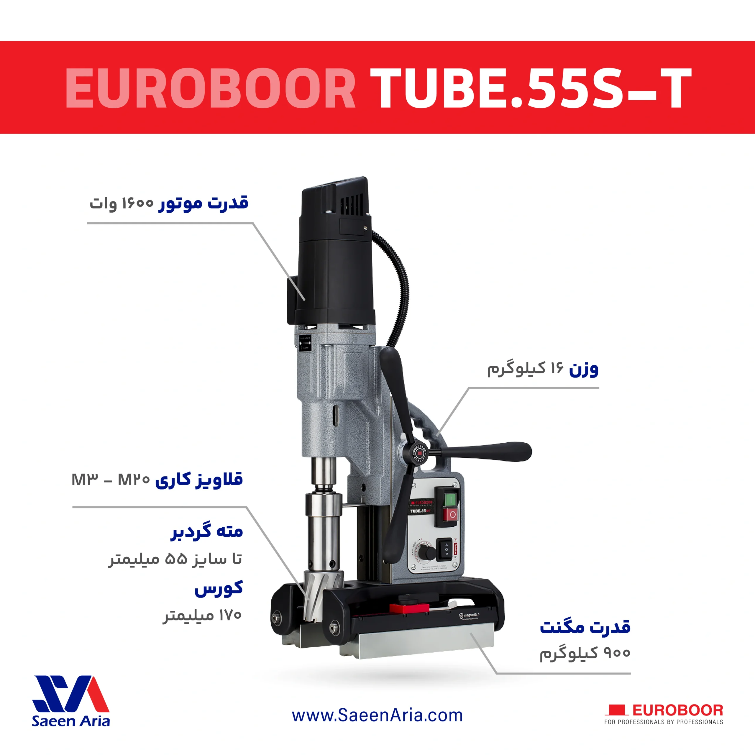دریل مگنت قابل حمل یوروبور، مدل TUBE.55S/T که یکی از قدرتمندترین دریلهای مگنت این شرکت هلندی میباشد، قابلیت ایجاد سوراخ بر روی سطوح و حتی لوله را دارد. این دریل مگنت یوروبور 16 کیلوگرمی قابلیت سوراخ کاری تا عمق 55 میلیمتر را دارد و در کنار امکان سوراخ کاری، میتوان به عنوان یک دستگاه ضربه زن یا تپینگ از آن استفاده کرد. این دستگاه دارای مگنت قدرتمندی میباشد که امکان چرخش روی سطوح مورب مانند لوله را دارد و به سادگی روی لولههای به قطر 80 میلیمتر و حتی بالاتر، قابلیت جابجایی دارد.