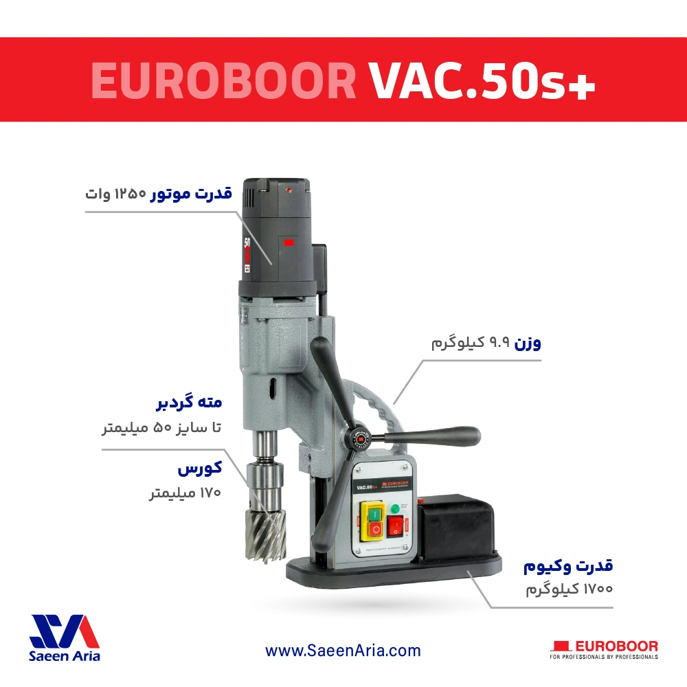 دریل وکیوم +VAC.50s یک دستگاه کاملا حرفهای با سرمته گردبر جهت ایجاد برش تا عمق 55 میلیمتر میباشد که گزینه مناسبی جهت سوراخ کاری در سطوح افقی و غیرمغناطیسی است. به عبارتی این دریل مناسب سطوحی است که خاصیت مگنتی ندارند و امگان سوراخکاری با دریلهای مگنت برای آنها فراهم نیست.